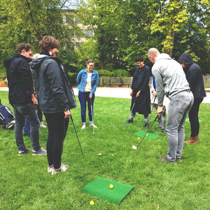 Bij stadsgolf gebruiken we originele golfclubs en de daarbij horende golftechniek met een lichter balletje. Je golft langs kerken, over pleinen en ontdekt de mooiste plekjes die de stad te bieden heeft. De holes zijn alledaagse attributen uit het straatbeeld zoals een standbeeld, brugje, waterloop,...
